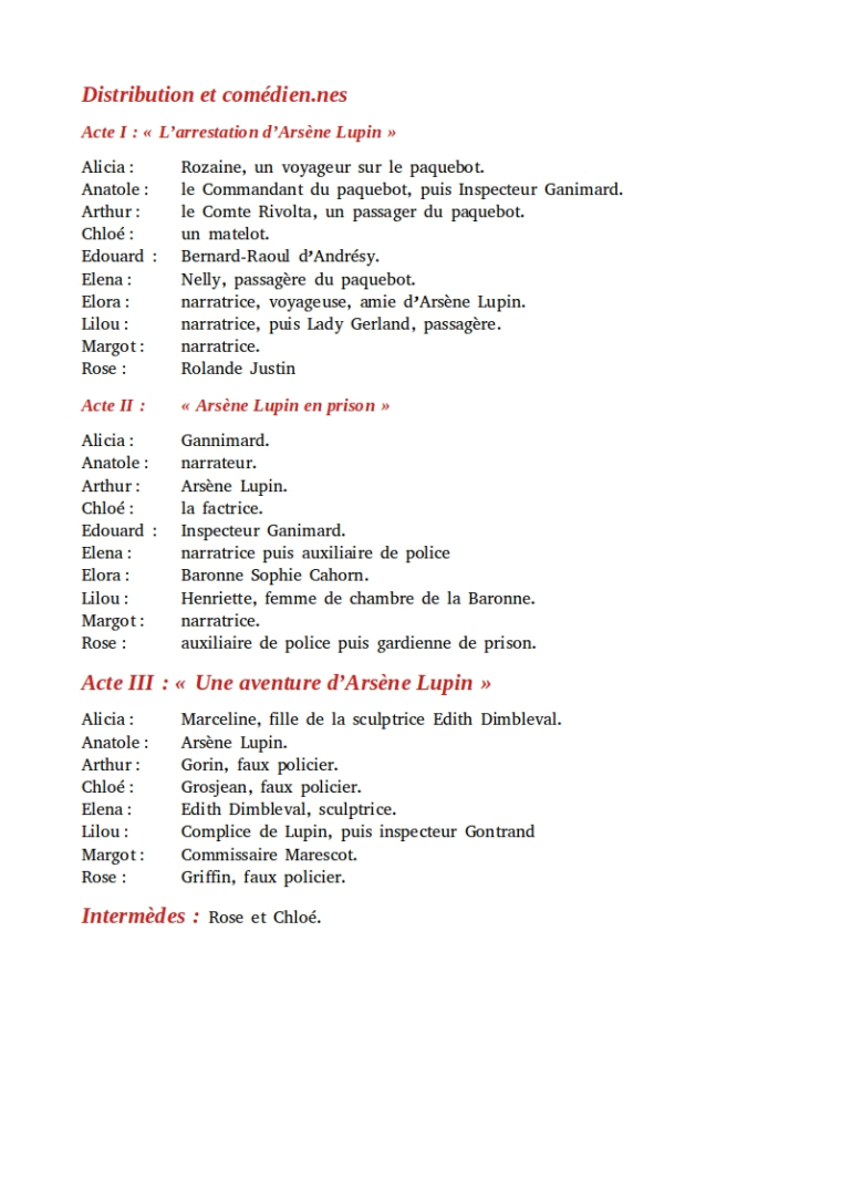 L’acte III, quant à lui, est à l’origine une pièce théâtrale écrite en 1911, intitulée « Une aventure d’Arsène Lupin », Je l’ai comme d’habitude adaptée en tenant compte du profil de nos jeunes acteurs et actrices.